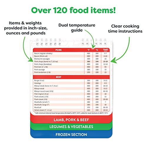 • Air fryer cooking times chart magnet, times and temp guide. Special sections include: tips & tricks, steak doneness prime rib cook temperature chart, safe minimum internal meat temps, vast Legumes & Vegetables section for vegans, and unique Bakery, Desserts & Snacks category.