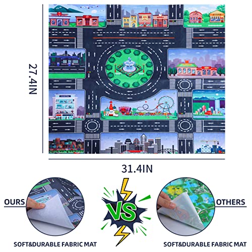 • 【SIMULATION SCENE PLAY MAT】- The play mat is made of soft non-woven fabric instead of thin PVC, eco-friendly, foldable for storage, increases friction with the ground and makes the vehicle drive smoothly on it. The play mat shows us a colorful life scenes, including roads, buildings, hospitals, restaurants, etc. The pattern is clear and not easy to fade. It is large enough to allow 2 to 4 kids players to spend hours of playful fun together. Play mat size: 31.4″x27.4″.