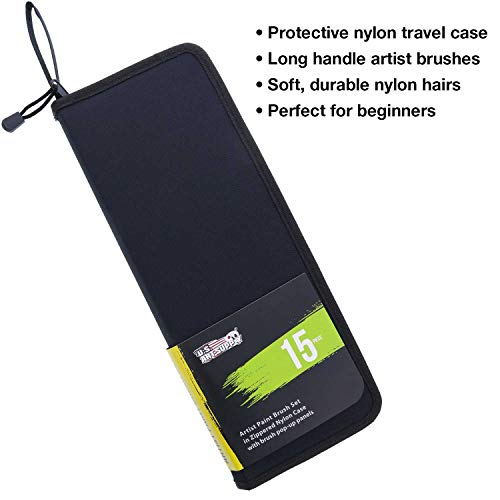 - 15 Piece Long Handle Artist Taklon Brush set for acrylic, watercolor, gouache, plein air & face painting